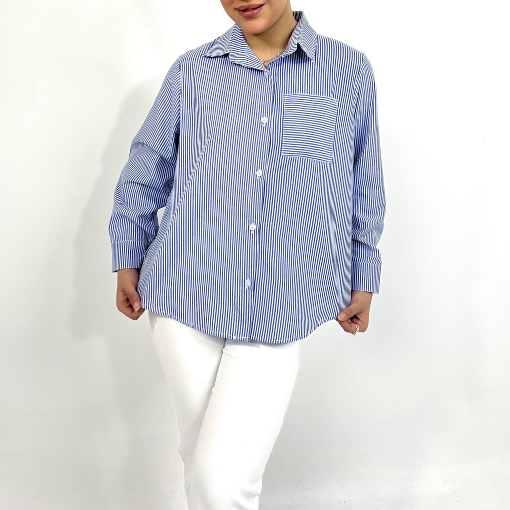 شومیز ابی راه راه | شومیز تک جیب فری سایز برند پانیذ کد 118